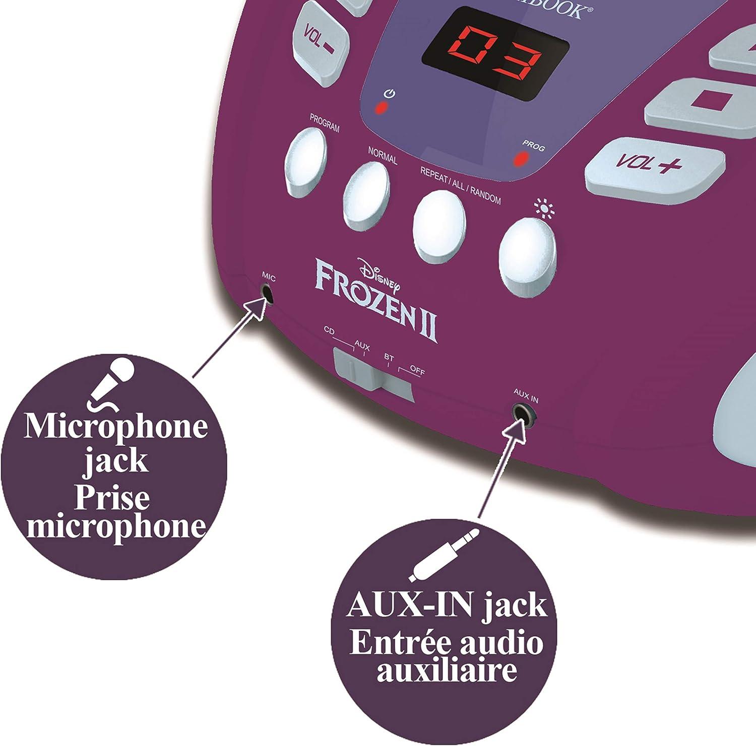 LEXiBOOK – Disney Frozen 2 – Bluetooth CD Player for Kids – Portable, Multicoloured Light Effects, Microphone Jack, Aux-in Jack, AC or Battery-Operated, Girls, Boys, Violet, RCD109FZ(CD Player with Bluetooth)