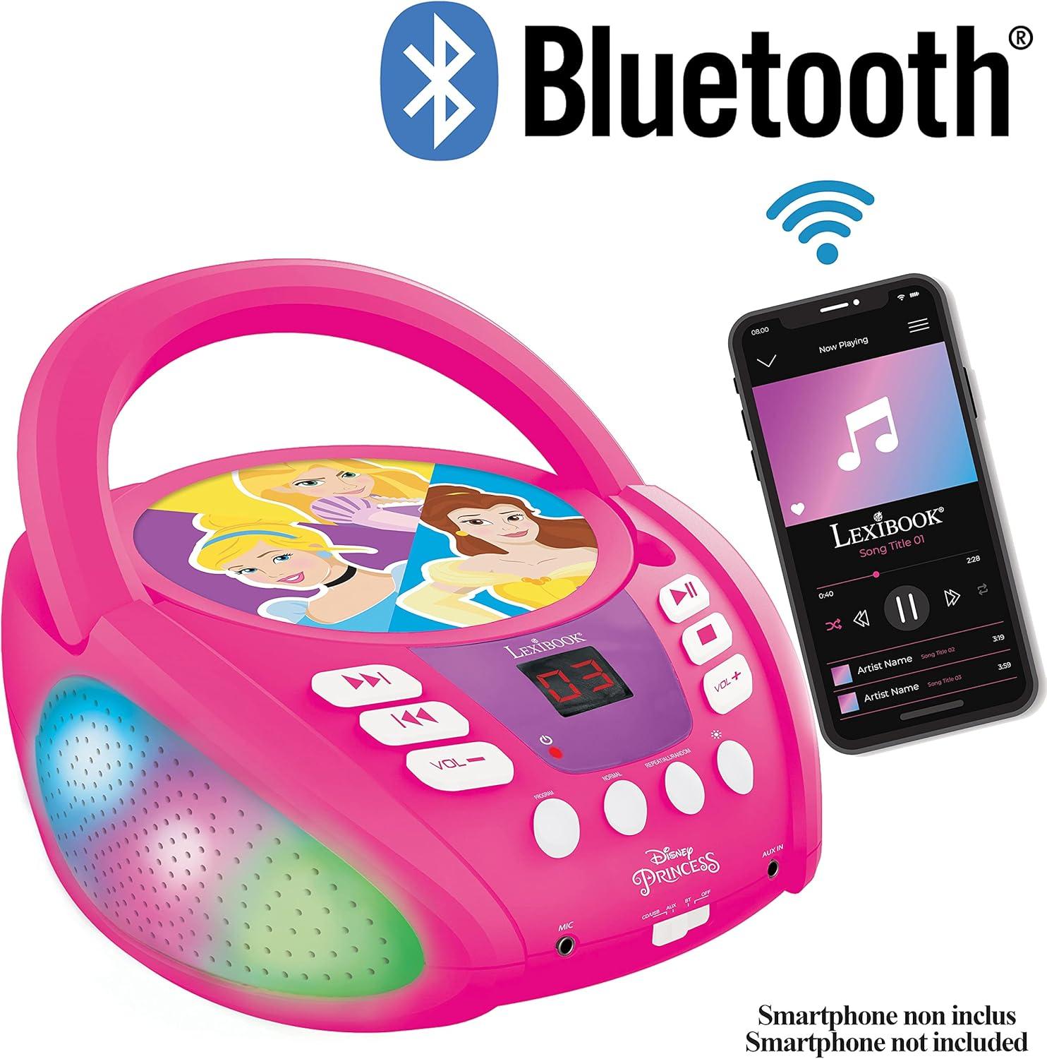 LEXiBOOK – Disney Princess – Bluetooth CD Player for Kids – Portable, Multicoloured Light Effects, Microphone Jack, Aux-in Jack, AC or Battery-Operated, RCD109DP