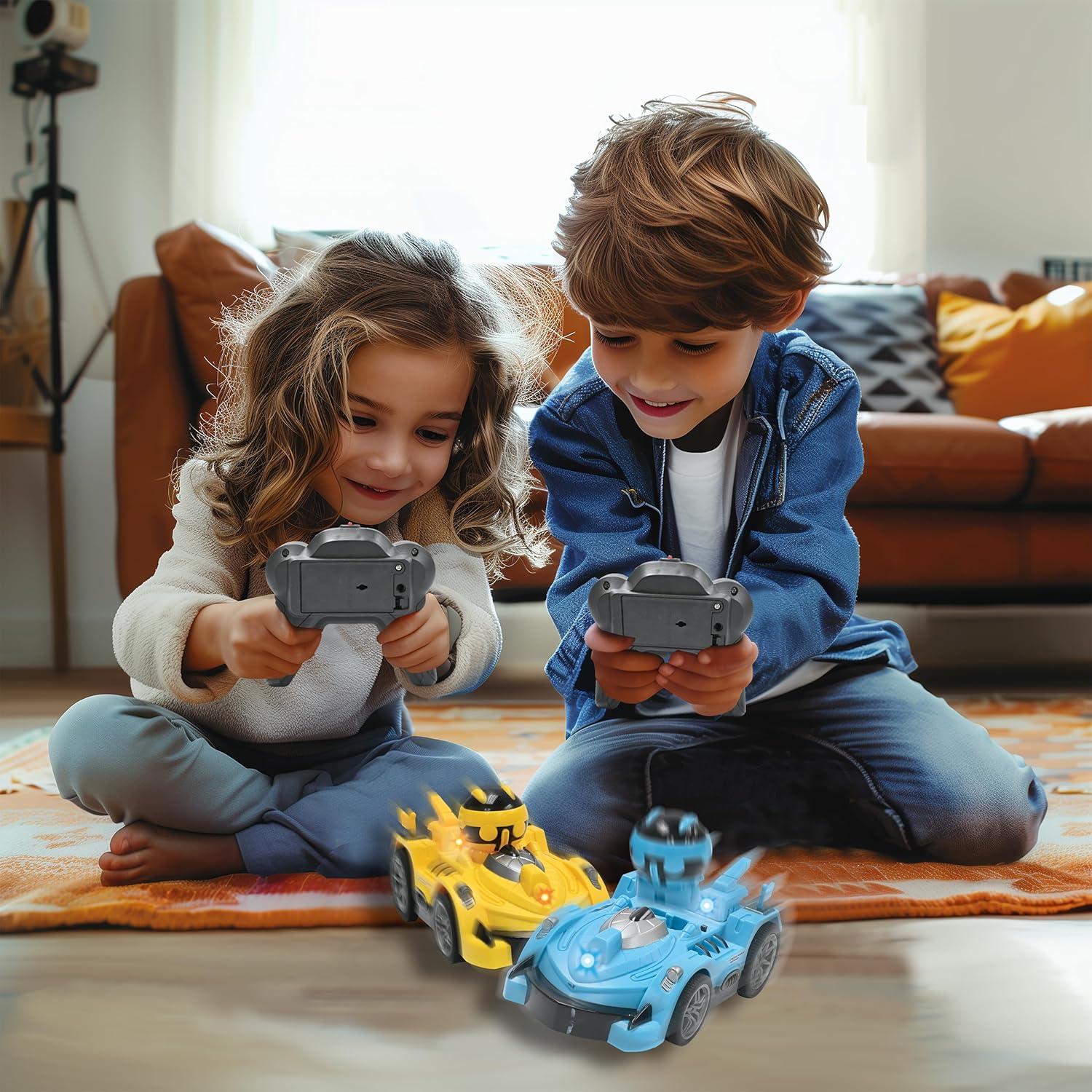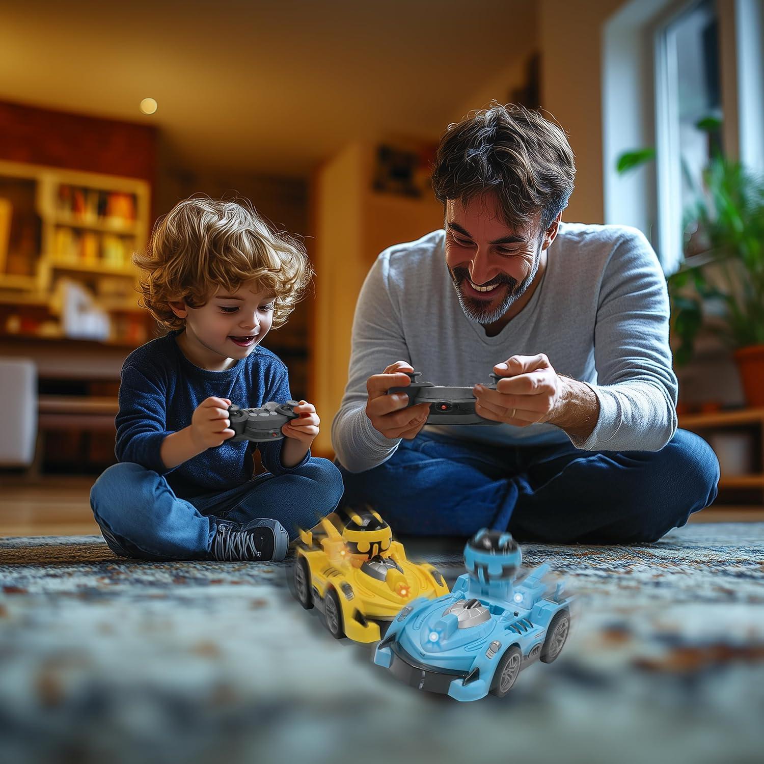 Take control of the action with your set of two RC Bumper radio-controlled racing cars, perfect for thrilling battles and races! This set includes two remote-controlled bumper cars and two removable characters, providing hours of entertainment for kids young and old. The RC Bumper Cars are designed to bump into each other, adding an exciting dimension to traditional racing games. Built-in sound and light effects make every collision and race even more exciting. Kids will love the realistic sounds and flashing lights that make every race unforgettable. With a maximum speed of 12km/h (7mph) and a frequency of 2.4GHz, these cars offer optimum performance for interference-free racing. Win the race by ejecting the opposing robot when hitting the car's side buttons. This unique feature adds an element of strategy and surprise to every battle, guaranteeing laughter and cheers with every victory. This RC Bumper Car set is the perfect gift for kids who love action and adventure. Give them hours of play and competition with the radio-controlled RC Bumper racing cars!