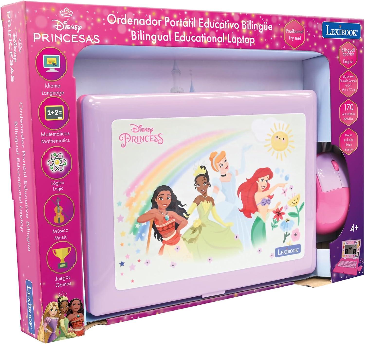 Discover the ultimate learning companion for your kids: our Disney Princess Educational Bilingual Laptop in English and Spanish! With its bright pink and blue design, children can learn and have fun with Disney Princess. Designed to spark curiosity and foster knowledge, this laptop offers 170 engaging activities—85 in English and 85 in Spanish—covering a wide range of subjects from language arts to mathematics, general knowledge, logic, clock reading, and even music. Each activity is crafted to challenge and elevate your child’s learning experience, with varying levels to adapt as they grow. After a rewarding learning session, kids can unwind with a selection of entertaining games like Snake, Maze, and Plane Races. This educational laptop’s design is ergonomically inspired by real laptops, ensuring a comfortable and natural experience for little hands. Its convenient size and easy handgrip make it the perfect educational tool for on-the-go learning. With lovely music and melodies to delight their ears and a large 9.7″” LCD screen that bursts with animations, children will be visually and audibly engaged. Plus, the computer keyboard allows for interactive play and helps kids practice their typing skills. Powered by 2 x AA/LR6 batteries, forget about inconvenient cables and enjoy wireless entertainment. The Lexibook Disney Princess bilingual educational laptop isn’t just a toy; it’s a gateway to a world of learning and fun!