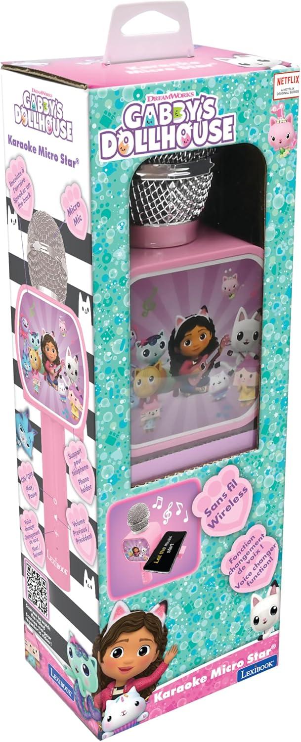 Discover Gabby's Dollhouse wireless microphone with built-in speaker from Lexibook, the perfect accessory to reveal your kids' talent! The microphone is compatible with all Bluetooth®-enabled devices, making it easy to connect to a smartphone, tablet or computer. Thanks to the music volume control, your children can adjust the sound to their likes and tastes for optimal performance together with Gabby and Pandy Paws. Have fun with the flue change function! With three available effects – echo, loud womanous and low male voice – children can have fun changing their voice and induce unforgettable laughing moments. Simply press a button to select the desired effect. With a battery life of several hours, this microphone allows long vocal moments without frequent charging. In addition, the 3W speaker delivers optimal sound quality, ensuring that each tone is bright and powerful. Finally, this Gabby's Dollhouse microphone is equipped with a retractable phone holder, perfect for reading song lyrics while singing. This practical stand allows children to follow the text without having to hold their phone, giving them total freedom to concentrate on their appearance. Whether at parties, karaoke nights or just for fun at home, the Lexibook Gabby's Dollhouse Wireless Microphone with Built-In Speaker is the perfect choice for young singers of the past. Give your kids hours of entertainment and let them express their voices with this fun and versatile microphone.