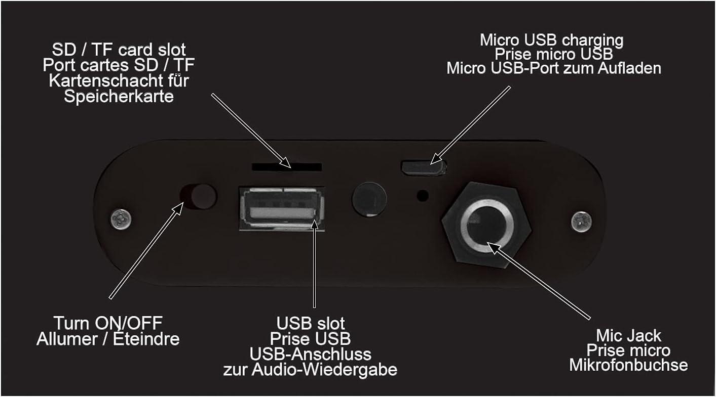 A powerful and portable boombox with light effects to create a party atmosphere anytime, anywhere: at home, at parties, on vacation, it can be taken everywhere thanks to its handle. Bluetooth® connectivity, connects wirelessly with your smartphones, tablets and other audio devices equipped with Bluetooth technology. The speaker becomes a karaoke thanks to the microphone included. With USB port, micro SD / TF card port (up to 32 GB) and aux-in port for broadcasting music, podcasts and MP3s from any audio source! True Wireless Stereo (TWS) function: synchronize 2 together to enjoy a stereo sound! 1,200 mAh built-in battery, rechargeable via micro USB cable (included). Up to 3 hours of continuous use.
