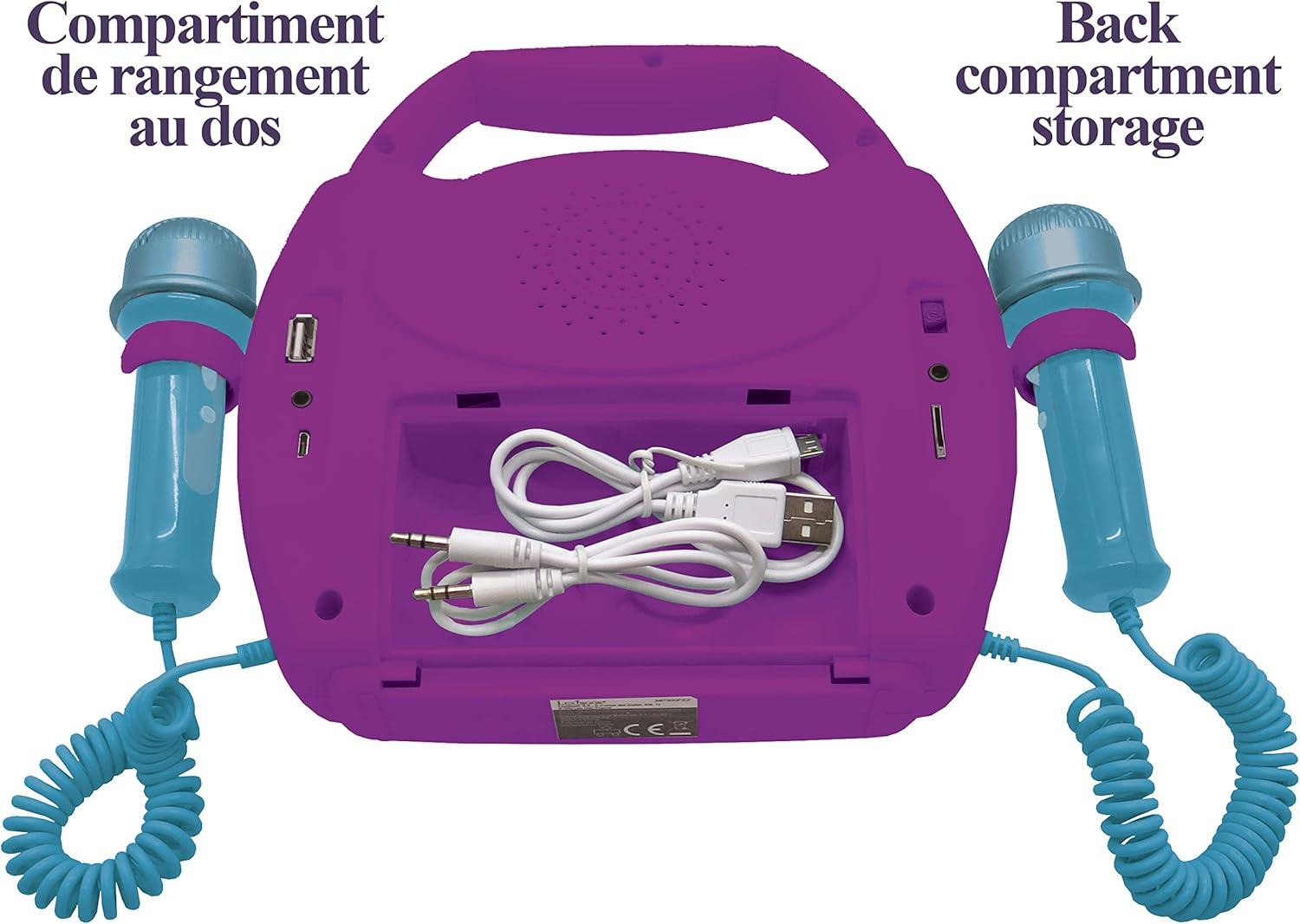 The portable karaoke player Paw Patrol for kids, operates wirelessly with Bluetooth-equipped devices! 2 microphones included to sing like a star with the heroes of Paw Patrol, Chase and Marshall! AUX-IN slots, USB port and TF/micro SD card slots (until 32 GB) to listen to music from external audio devices! Headphones jack. Record function to record yourself while singing. Voice changer function for hours of fun! 3 tunes: high pitched, deep pitched or echo voice. Multicolour light effects! Power supply: 1,200 mAh rechargeable battery via USB-C (cable included). With a storage compartment to store the various cables.