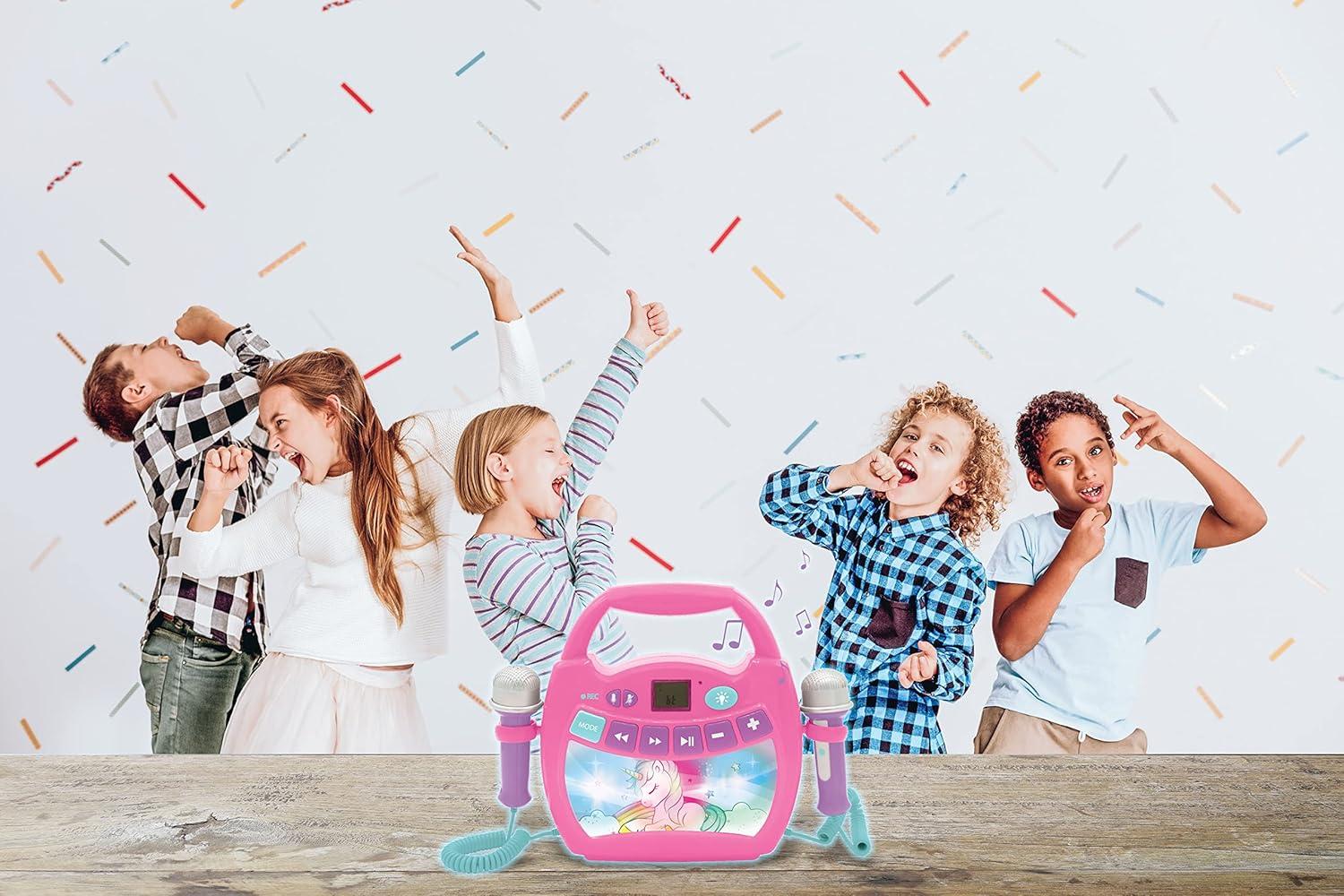 The portable karaoke player Paw Patrol for kids, operates wirelessly with Bluetooth-equipped devices! 2 microphones included to sing like a star with the heroes of Paw Patrol, Chase and Marshall! AUX-IN slots, USB port and TF/micro SD card slots (until 32 GB) to listen to music from external audio devices! Headphones jack. Record function to record yourself while singing. Voice changer function for hours of fun! 3 tunes: high pitched, deep pitched or echo voice. Multicolour light effects! Power supply: 1,200 mAh rechargeable battery via USB-C (cable included). With a storage compartment to store the various cables.