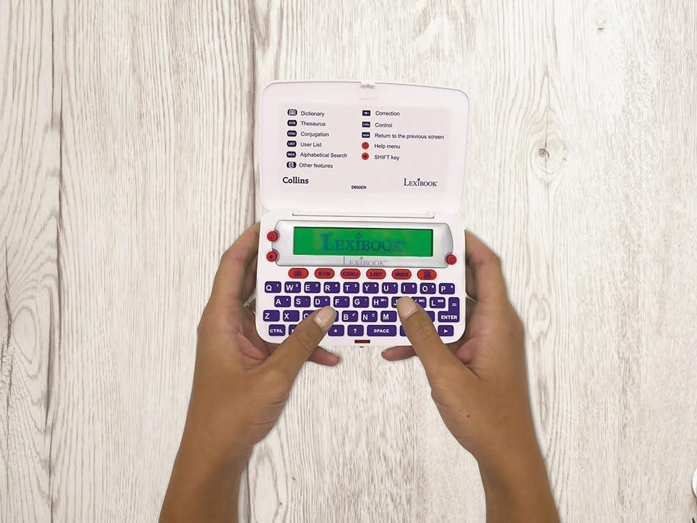 Your No.1 companion for anyone seeking knowledge or simply loving the English language. 725,000 words, meanings and phrases – 8,000 verbs from the Collins English Dictionary, 13th edition. Others powerful features: Lexibook's Thesaurus, Phonetic spell-correction, Spellchecker, crossword solver with words from the Collins English Dictionary, 13th edition. Lexibook's Conjugation: more than 7,000 verbs derived form 4 tenses (simple present, simple past, present and past participle). 3 words games: Hangman, Word jumble & Anagram. Large 4-lines screen for easy reading and new ergonomic size with large buttons. Magnifying function to make things on the screen easier to see. Other uses: calculator, currency and unit converters & User-list. Help on screen at any time.
